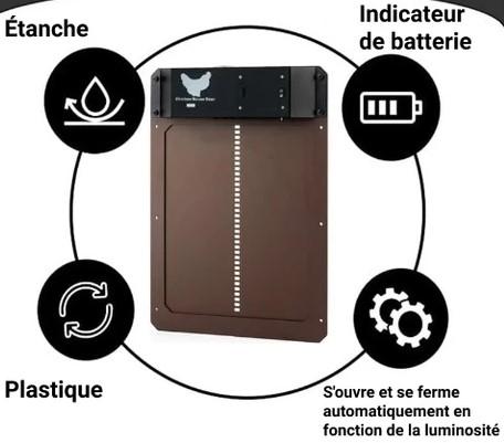 Grâce au capteur de luminosité, la Porte De Poulailler s’ouvre et se ferme automatiquement en fonction de la lumière du jour.