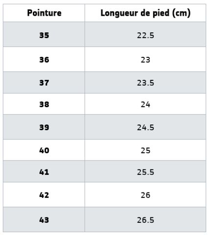 Avant de commander, choisissez votre pointure en vous référant à la grille suivante :
