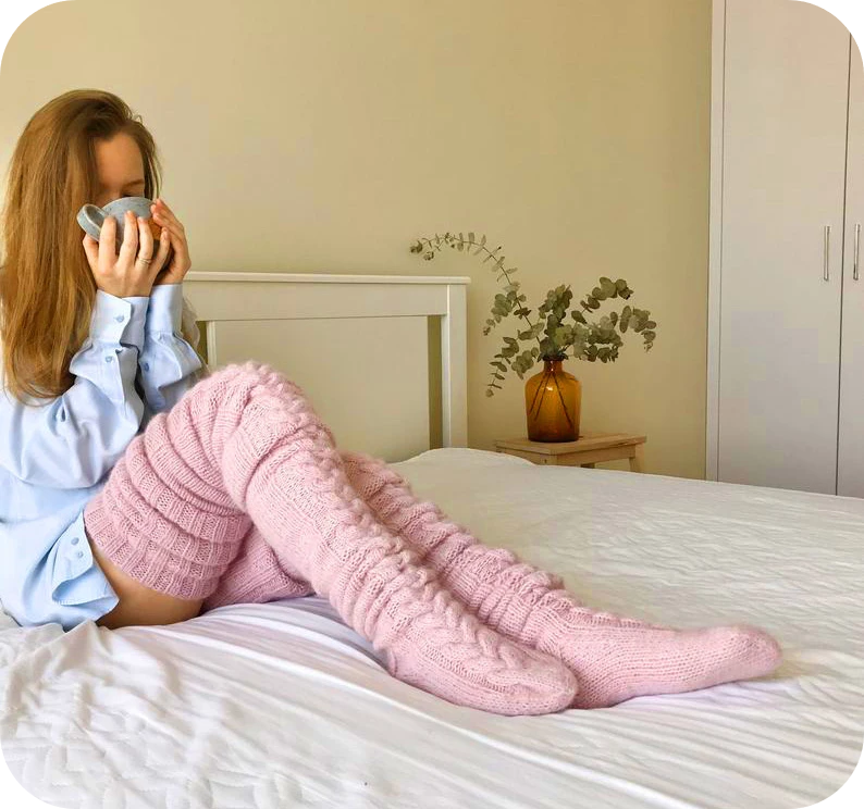 EXTRA LONGUE: Pourquoi s’arrêter aux pieds, quand on peut avoir chaud jusqu’aux genoux ? Portez-les souples, à hauteur de genou ou étendus au-dessus du genou. –ils vous feront avoir l’air fabuleux et se sentir bien dans tous les cas !