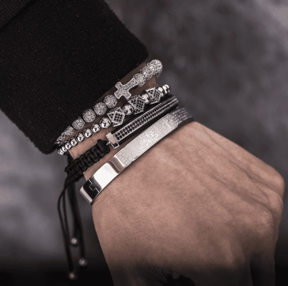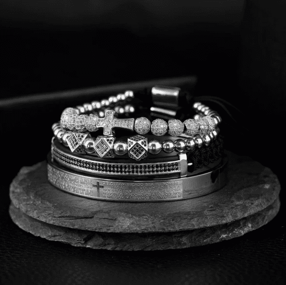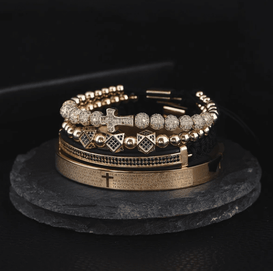 Mélangez et assortissez selon votre style avec le bracelet de luxe en 4 pièces. Comprend des écritures espagnoles gravées de manière artisanale, une breloque en croix, une touche de finition plaquée or de haute qualité pour vous donner un look exquis et luxueux.