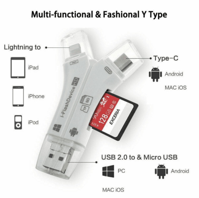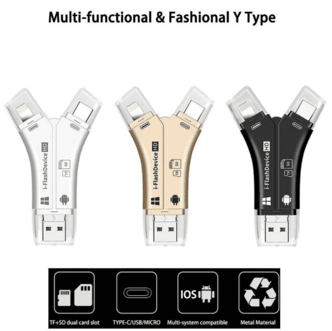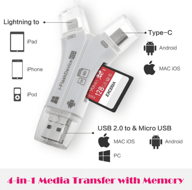 Accédez aux données de vos cartes mémoire avec ce transfert multimédia 4 en 1 avec carte mémoire. Il convient à tous les appareils avec 4 interfaces. Cet outil durable est idéal pour échanger des données entre appareils. C’est l’option parfaite pour gérer les photos, sauvegarder des documents et plus encore. Le lecteur de carte mémoire est facile à utiliser et pratique à transporter. Insérez simplement votre carte mémoire dans le lecteur de carte et branchez-la sur votre appareil. Le lecteur de carte est disponible en blanc ou noir, avec une carte mémoire de 16 Go, 32 Go ou 64 Go.