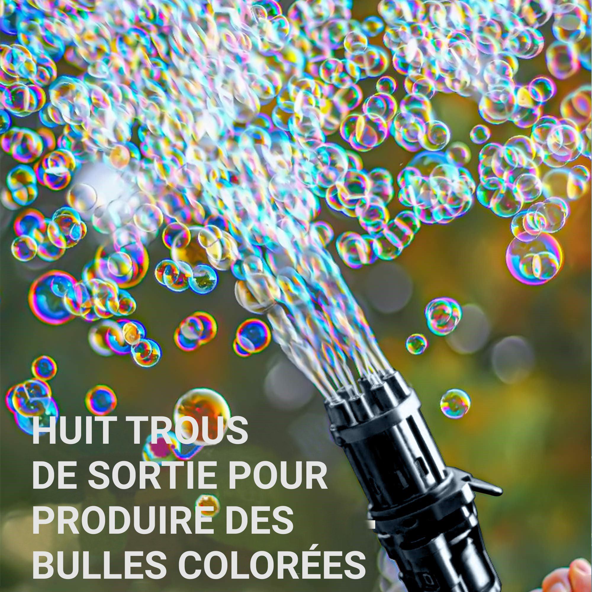 Jouet à Bulles dispose de 8 trous de sortie pour créer des centaines de bulles colorées par minute. C’est un jouet à bulles innovant et très amusant pour les enfants.