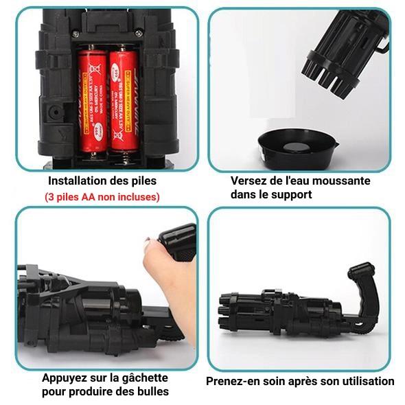 Le Jouet à Bulles est facile à monter et à utiliser, il fonctionne avec 3 piles AA (non incluses). Versez de l’eau savonneuse dans le support, et remuez doucement pour faire mousser le mélange. Plongez la tête du jouet dans le produit à bulles, et appuyez sur la gâchette pour créer des centaines de bulles colorées.