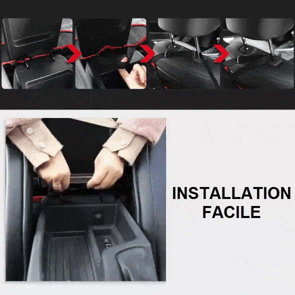 Avec 2 sangles réglables pour les sièges avant, et 1 pour la boîte d’accoudoir de votre console. Il suffit de les attacher en les ajustant à la taille idéale ! Aucun perçage nécessaire, l’installation prend moins d’une minute.