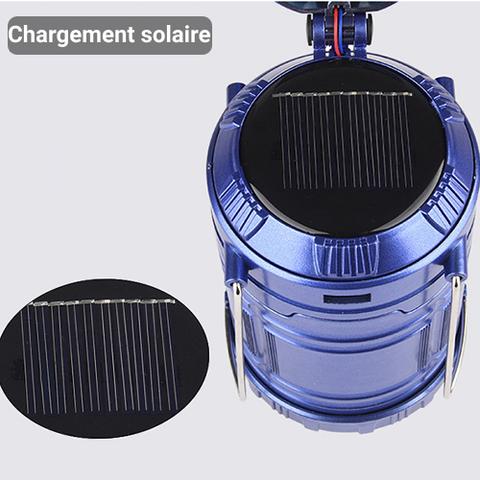Énergie solaire, chargement USB 5V DC, alimentation par 3 piles AA. Lorsque le voyant rouge s’allume, cela signifie que la lampe est en cours de chargement. Une fois complètement chargée, vous aurez une lumière stable et brillante où que vous soyez.