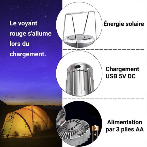 - Utilisation : Éclairage de camping, chargeur et ventilateur