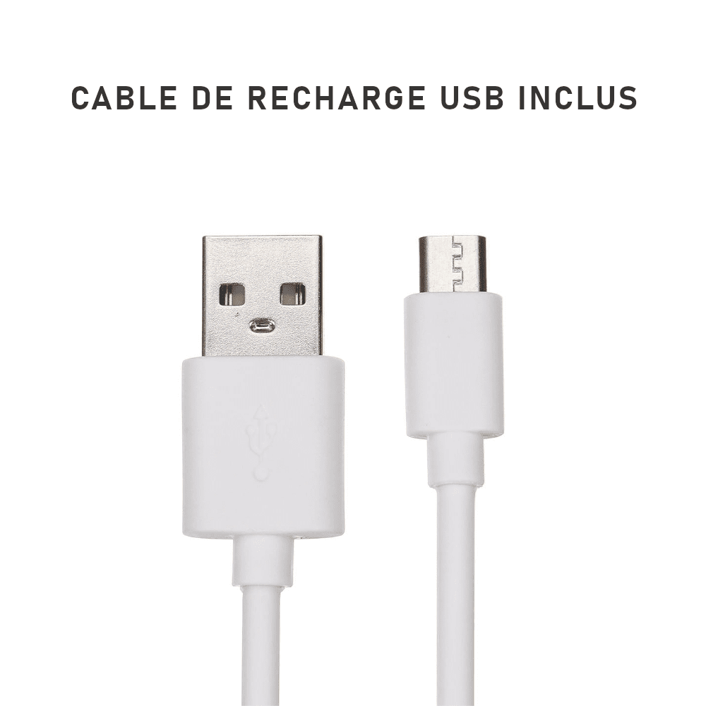 Recharge : USB, batterie lithium-ion (temps de charge : 90 min)