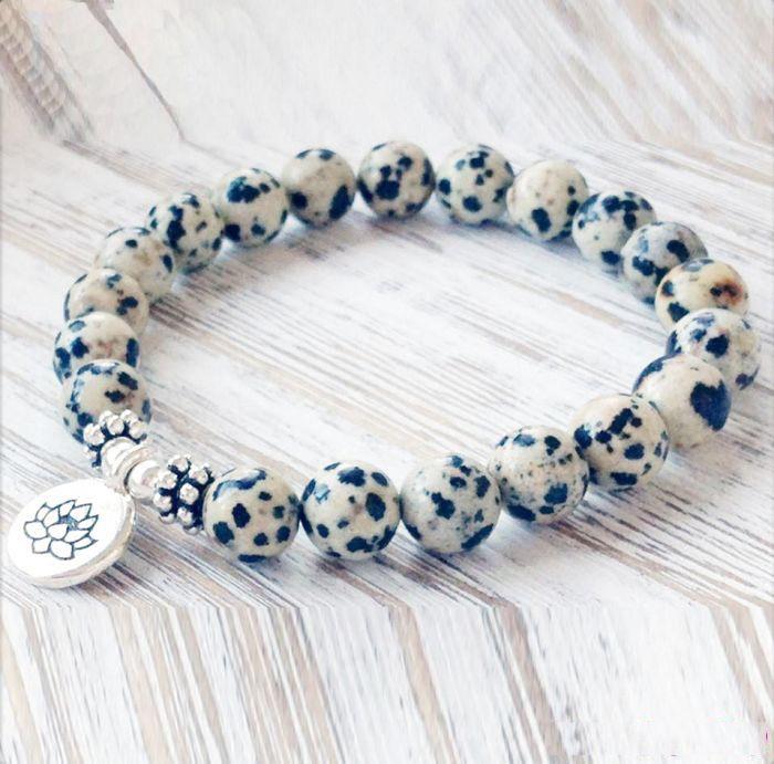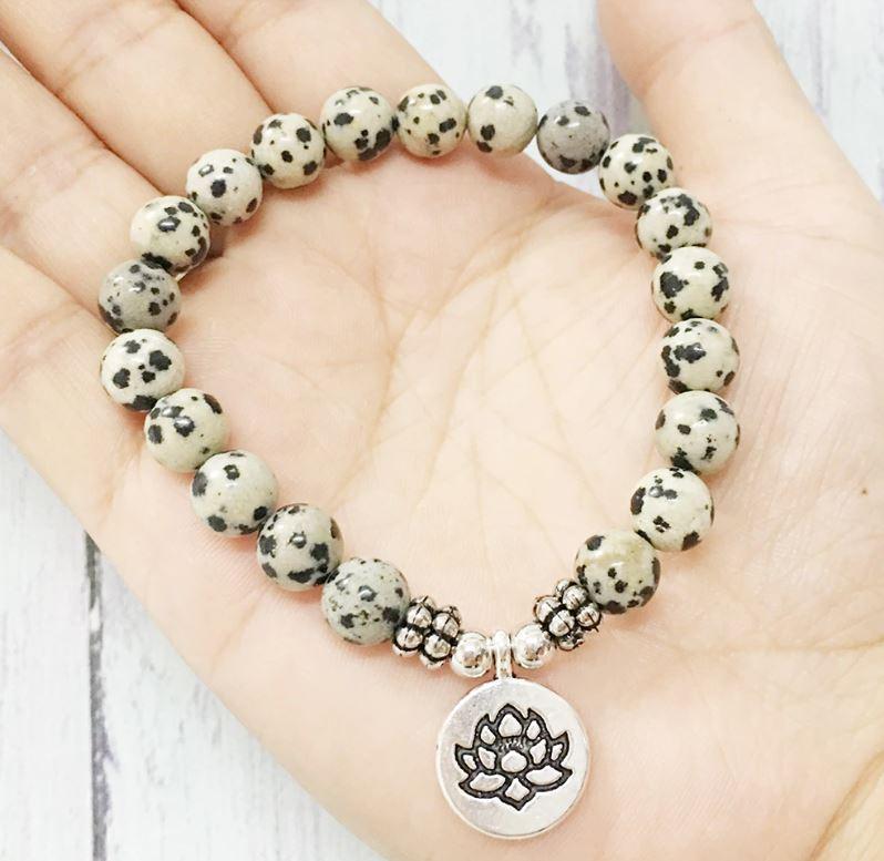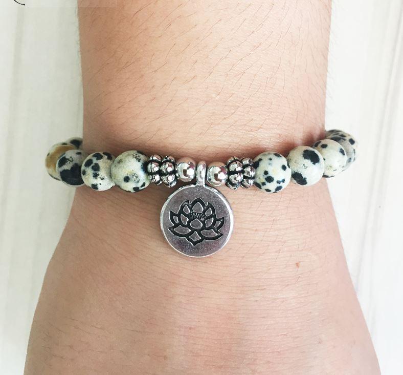 Lorsqu’il est porté au poignet, ce Bracelet Mala Lotus “Joie de l’Être” en Jaspe Dalmatien est un instrument utile pour arriver à un état de méditation profond. Il aide à préserver votre paix intérieure et à méditer sur le sens de la dualité de la vie. Vous pouvez ainsi rester focalisé sur la lumière du monde sans craindre son obscurité.