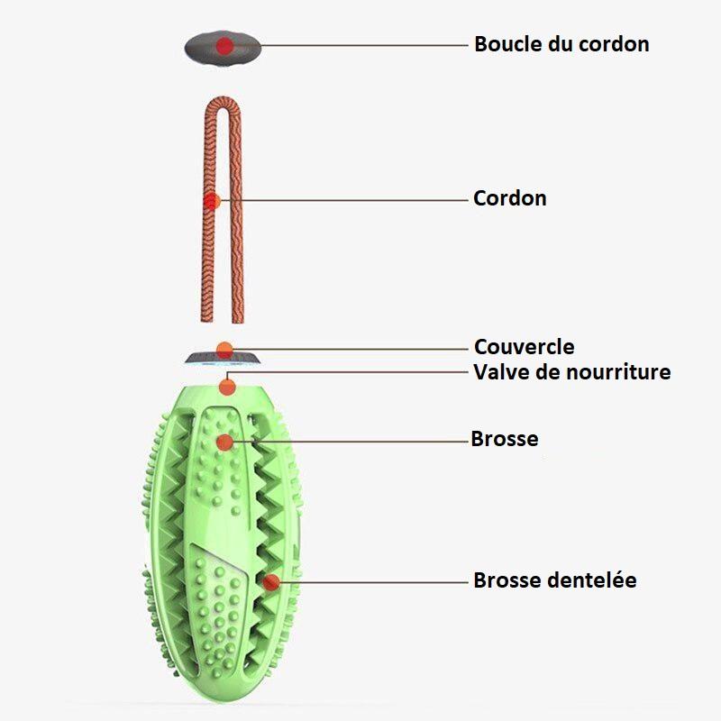Brosse à dents, distributeur de nourriture et jouet.
