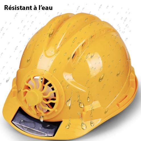 Un ventilateur à énergie solaire souffle de l’air par-dessus le casque. Lair chaud est ensuite évacué par les bouches d’aération situées sur le dessus du casque. L’air frais descend sur le visage de la personne et crée un micro-climat plus frais pour le travailleur.