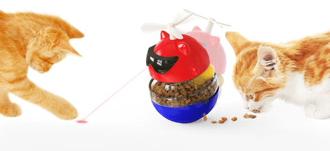 Les jouets font tomber de la nourriture pendant le jeu. Manger lentement favorise la santé du chat