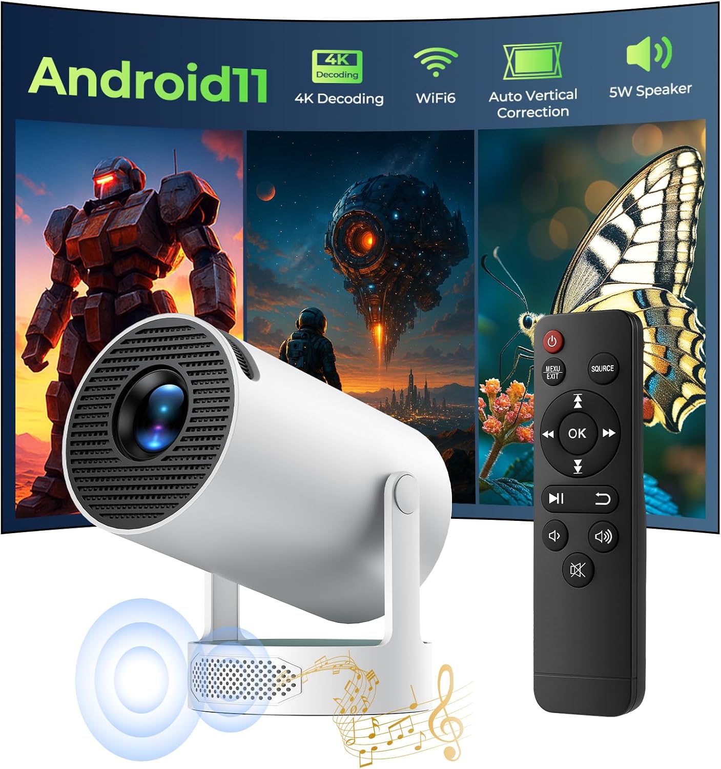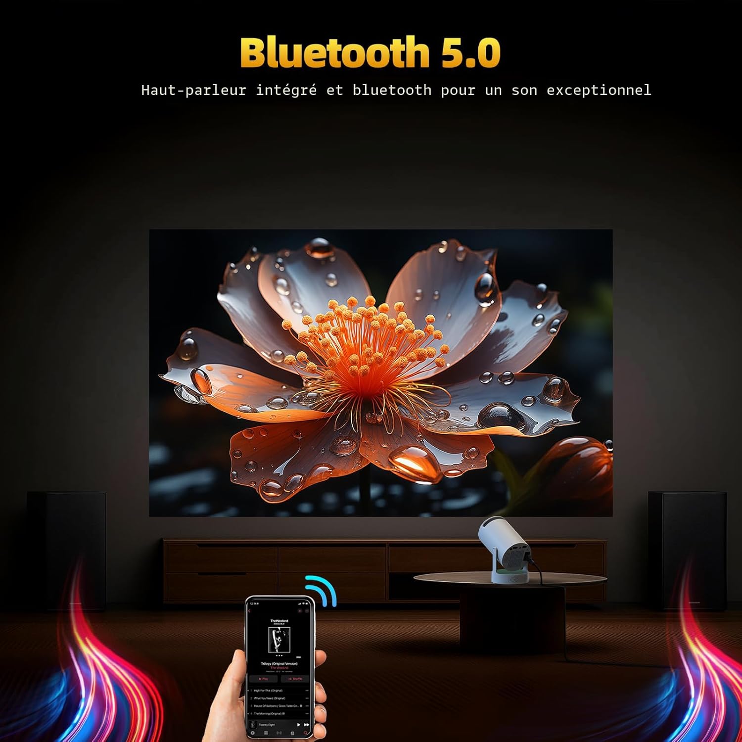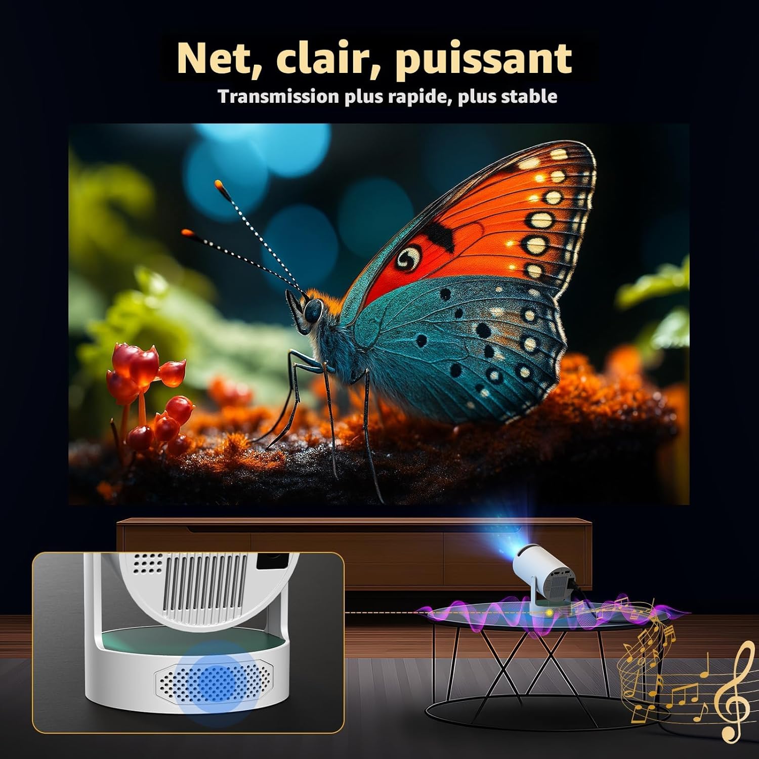 Pas besoin d’enceintes externes : le HY300 Pro intègre deux haut-parleurs stéréo de 5 W qui font très bien le travail. Le son est propre et suffisant pour une chambre, un salon ou même une soirée entre amis. En plus, il reste très silencieux (moins de 28 dB), donc on profite du film sans entendre le ventilateur tourner.