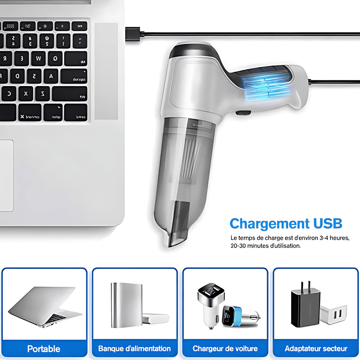 Équipé de 4 accessoires interchangeables, cet aspirateur est parfait pour divers besoins : nettoyage de la maison, de la voiture et même de l’ordinateur. Il peut également être utilisé pour compresser les sacs sous vide, gonfler des anneaux de natation ou encore comme souffleur et plumeau 4 en 1. Un outil multifonction qui s’adapte à toutes les situations !