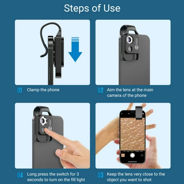 La conception ingénieuse de ce Mini microscope pour téléphonele rend extrêmement portable et facile à utiliser. Il suffit de le fixer sur l’objectif de la caméra de votre téléphone pour commencer à explorer. Compatible avec une large gamme de modèles de smartphones, il ne nécessite ni application spéciale, ni alimentation externe pour fonctionner. Son système de fixation rapide et sécurisé assure une stabilité parfaite pendant l’utilisation, permettant de capturer des images et des vidéos de haute qualité du monde microscopique.