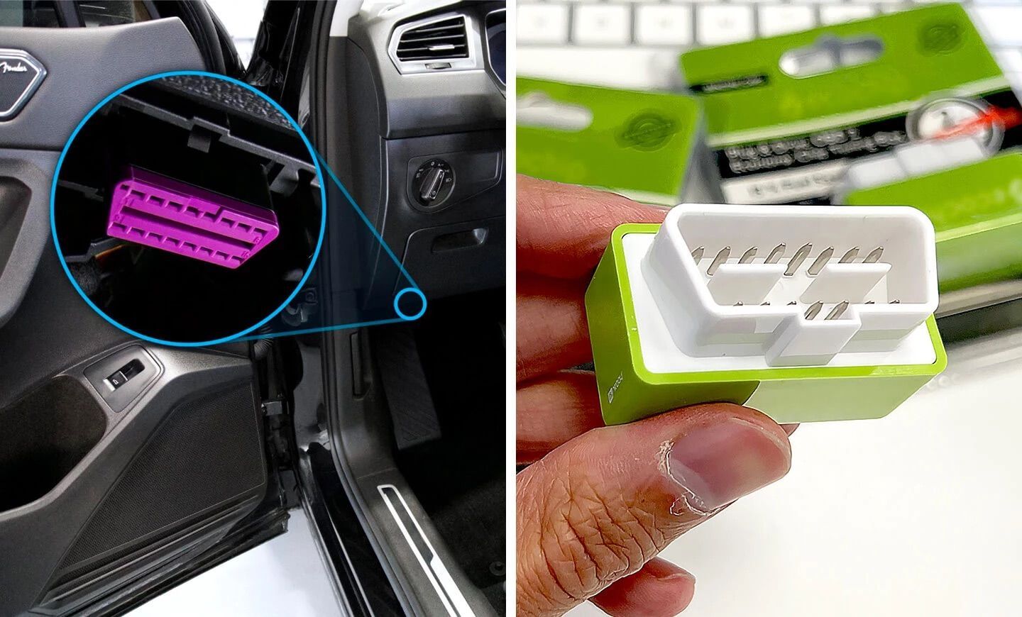 1. Brancher AutoPulsex sur le port OBD de votre voiture (toutes les voitures construites après 1996 en sont équipées) qui se trouve sous le tableau de bord, sous la colonne du volant.
