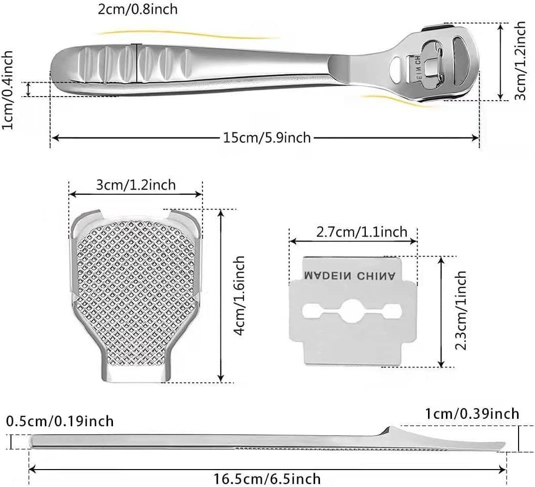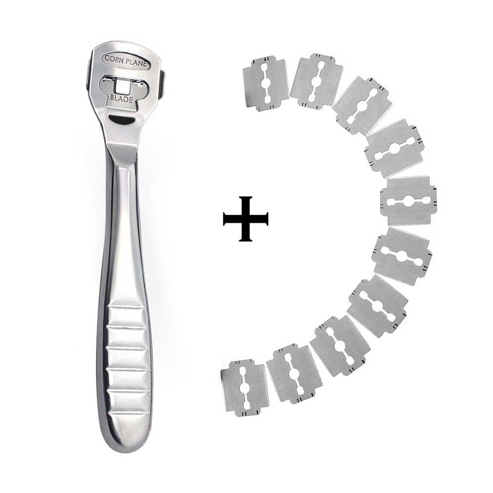 - Contenu du kit : 2 rasoirs pour pieds, 1 coupe-cors, 1 couteau multifonction, 10 lames de rechange