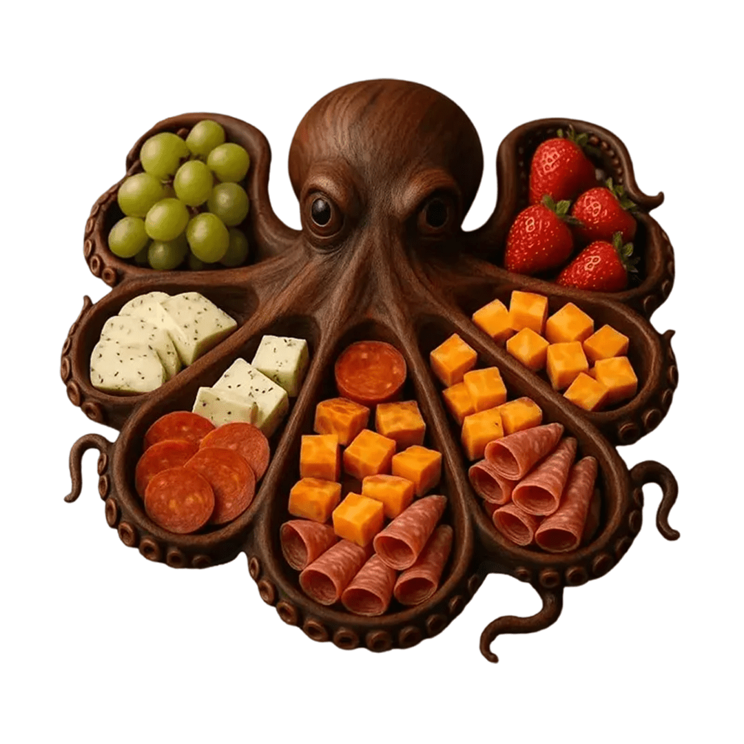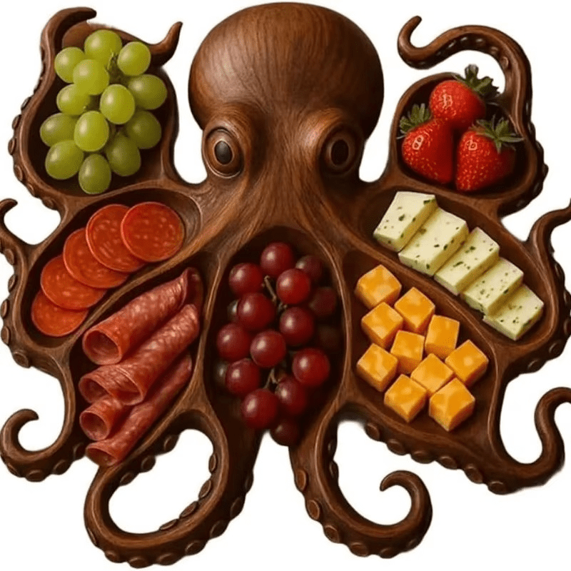 Solymall Plateau Apéritif en Bois – Design Pieuvre Sculpté à la Main Offrez à vos apéritifs une touche d’audace et d’élégance avec le plateau Solymall™ en forme de pieuvre. Plus qu’un simple accessoire de table, c’est une œuvre d’art qui transformera vos réceptions en événements inoubliables. Une pièce unique qui attire tous les regards Finies les tables fades et sans âme. Le plateau Solymall™ séduit par son design original et ses détails finement sculptés : chaque tentacule s’enroule gracieusement pour maintenir vos fruits, fromages et gourmandises en place. Un savoir-faire artisanal qui fait de chaque pièce un modèle unique, aucun ne se ressemblant. L’ambiance d’une fête, servie sur un plateau Qu’il s’agisse d’un anniversaire, d’une soirée à thème ou d’un dîner entre amis, ce plateau devient le centre de toutes les attentions. Les enfants s’amusent, les invités prennent des photos, et les conversations s’animent autour de cette pièce maîtresse surprenante.