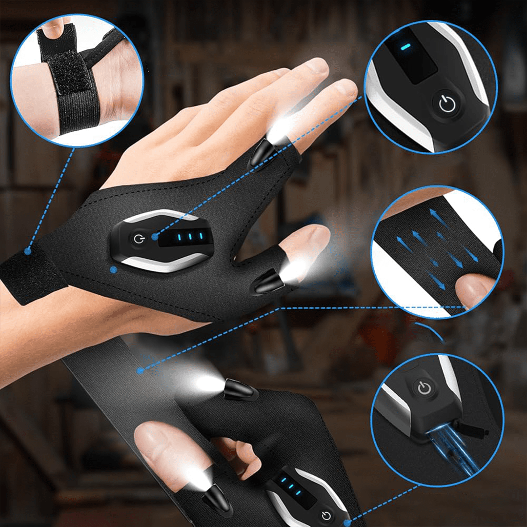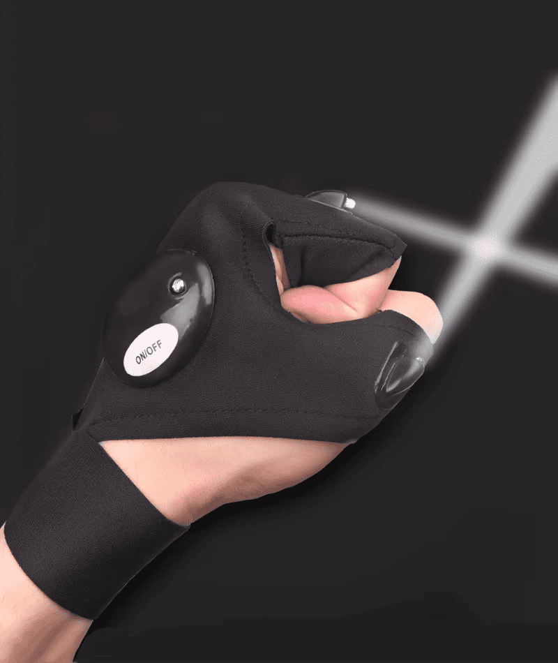 Le SuperGlove est un gant demi-doigt avec des petites lampes intégrées. Il permet d’éclairer directement ce que vous faites, sans avoir besoin de tenir une lampe. Les deux mains restent libres pour bricoler ou réparer, même dans le noir.