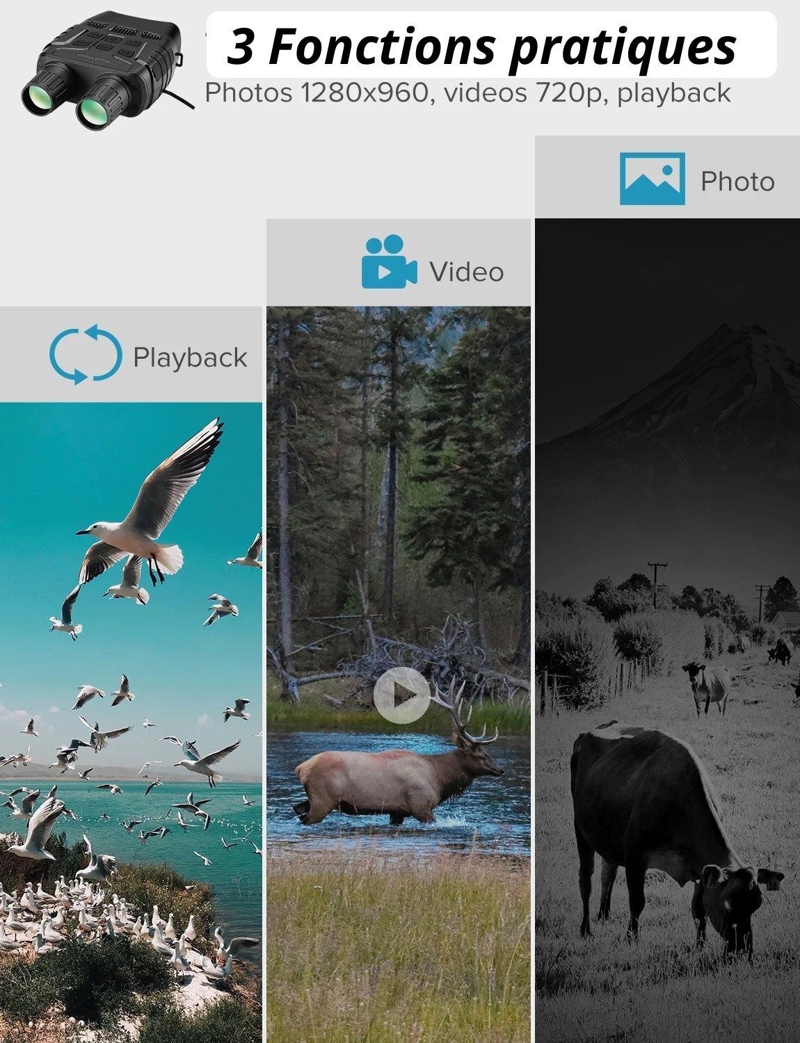 Ne vous contentez pas de voir dans l’obscurité – capturez chaque moment ! Les Jumelles Night Vision vous permettent de prendre des photos et d’enregistrer des vidéos en haute résolution, de jour comme de nuit. Avec une résolution vidéo de 720p et une résolution photo de 1280×960, vous obtiendrez des enregistrements clairs et détaillés. Stockez vos souvenirs sur une carte Micro SD et transférez-les facilement sur votre PC ou Mac via USB.